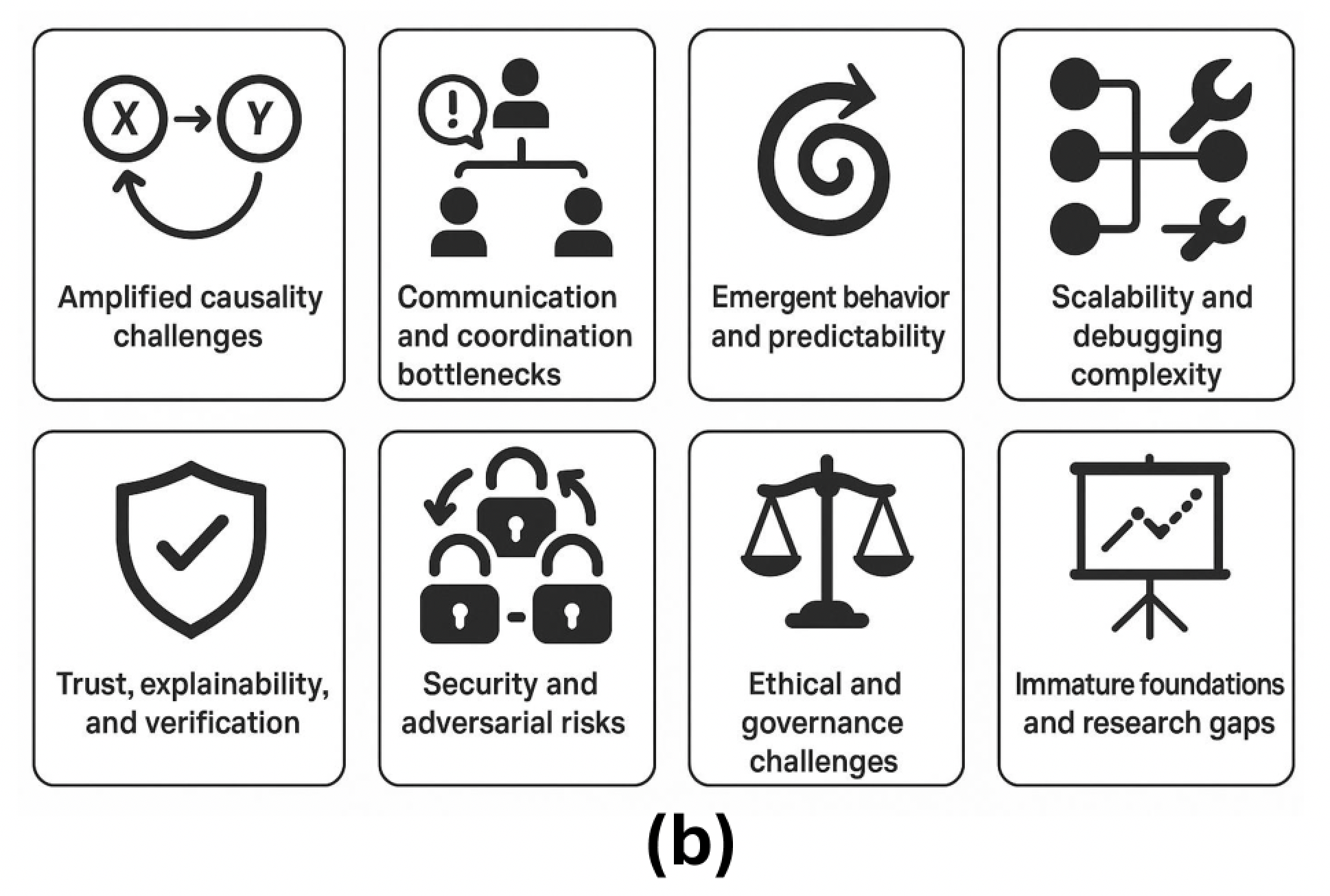 - Mỗi agent có logic riêng, bộ nhớ riêng → rất khó xác định vì sao hệ thống ra quyết định A thay vì B. - Thiếu log tổng hợp và không có phương pháp xác minh (verification) cho toàn bộ hệ thống. - Điều này là rào cản lớn khi áp dụng vào các hệ thống yêu cầu độ tin cậy cao. |